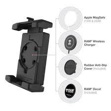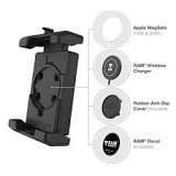 The RAM® Quick-Grip Pro XL Phone Holder with Ball & Vibration Damper (RAM-HOL-PD7BVU) is the next evolution of the RAM® Quick-Grip series, re-designed to be the most rugged universal phone holder that fits a wide range of phones and handheld devices with an integrated vibration damper. This phone holder features an integrated cavity for an Apple MagSafe puck, allowing you to turn the phone holder into a wireless charging solution. Not interested in charging? No problem! The included anti-slip cover ensures a flush fit when the Apple MagSafe puck is not installed. The RAM® Quick-Grip Pro XL features a spring-loaded design that allows easy one-handed insertion and removal of your device. Large and small shims are included to provide a snug, secure fit for large and small phones without a case. Complete the solution by building your mount—this holder is RAM® Compatible and includes a B size pin-lock ball. RAM® recommends installing the provided device tether when this holder is used in a vehicle with an open cockpit. It is important to verify the dimensions of your handheld device with its case, sleeve, or skin when determining the overall size.